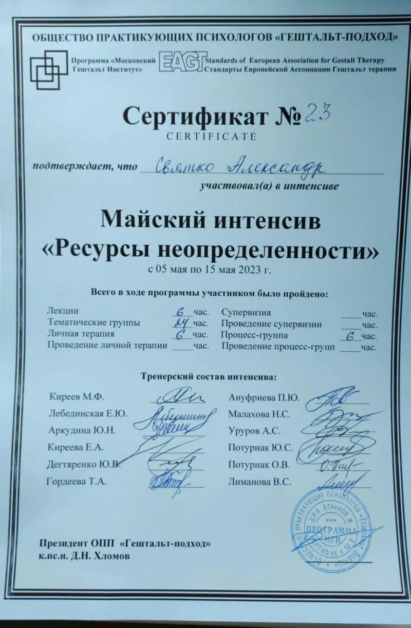- МГИ, Гештальт, 530 часов (с 2020 г.).