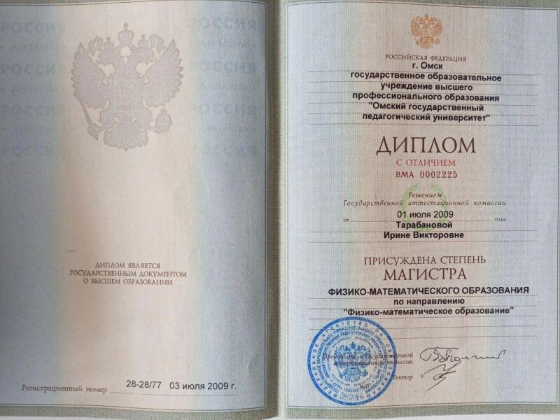 - Омский государственный педагогический университет, физико-математическое образование, магистр, 2007–2009 гг.