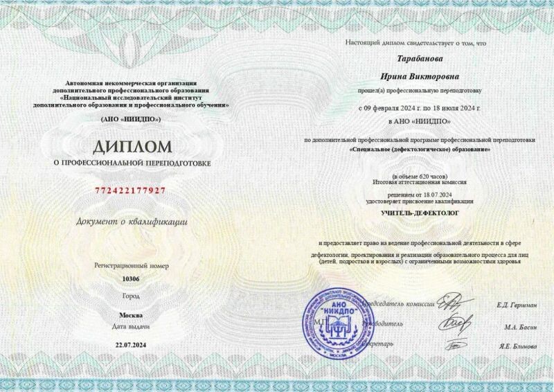 - АНО «НИИДПО», г. Москва, учитель-дефектолог, 2024 г.