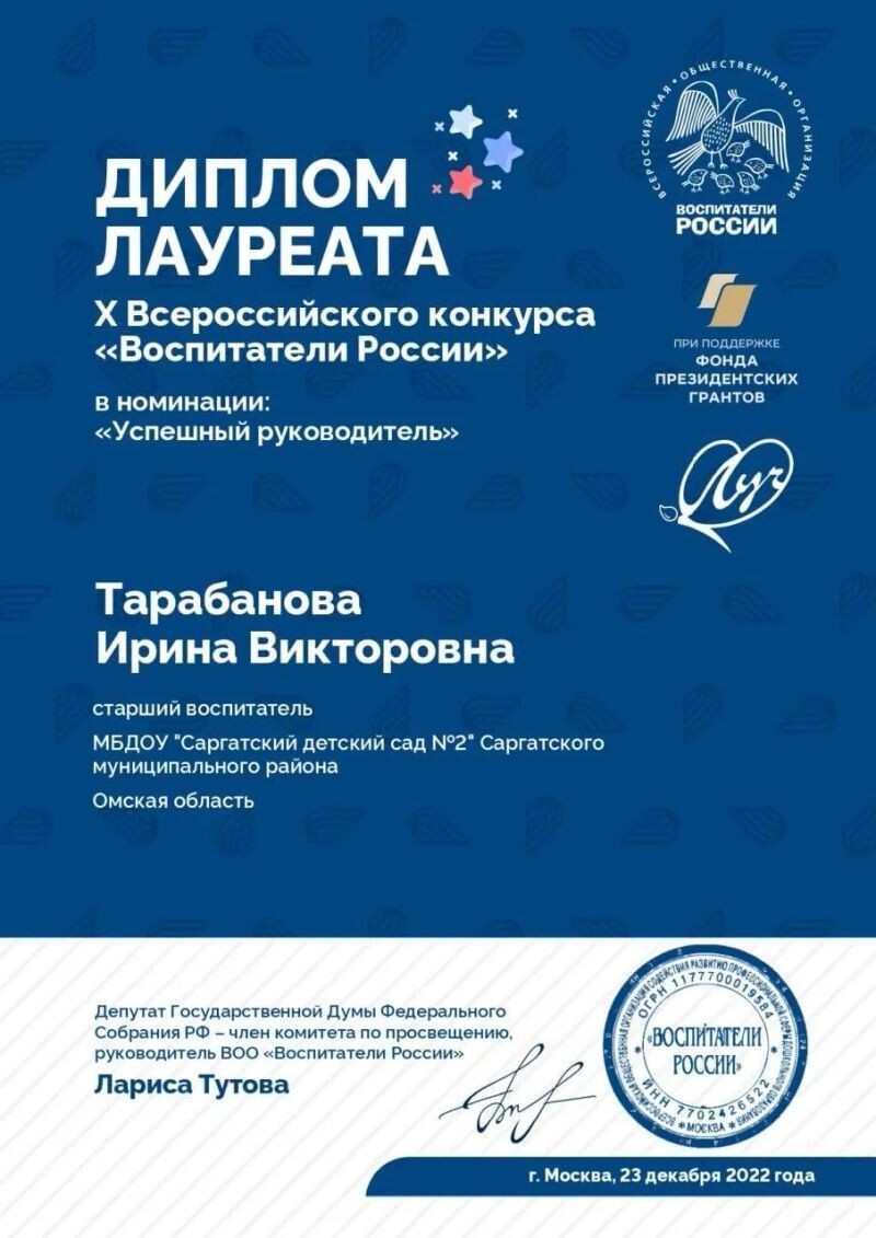- Лауреат Х Всероссийского конкурса «Воспитатели России» в номинации «Успешный руководитель», 2022 г.