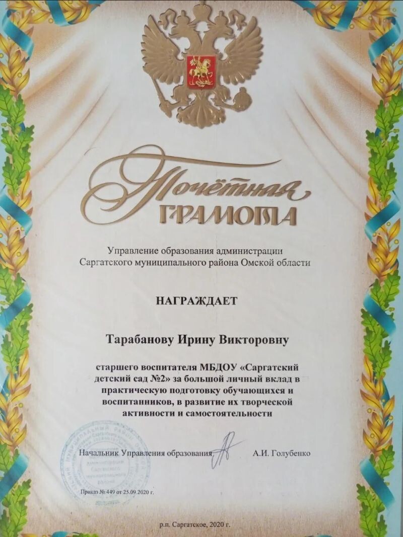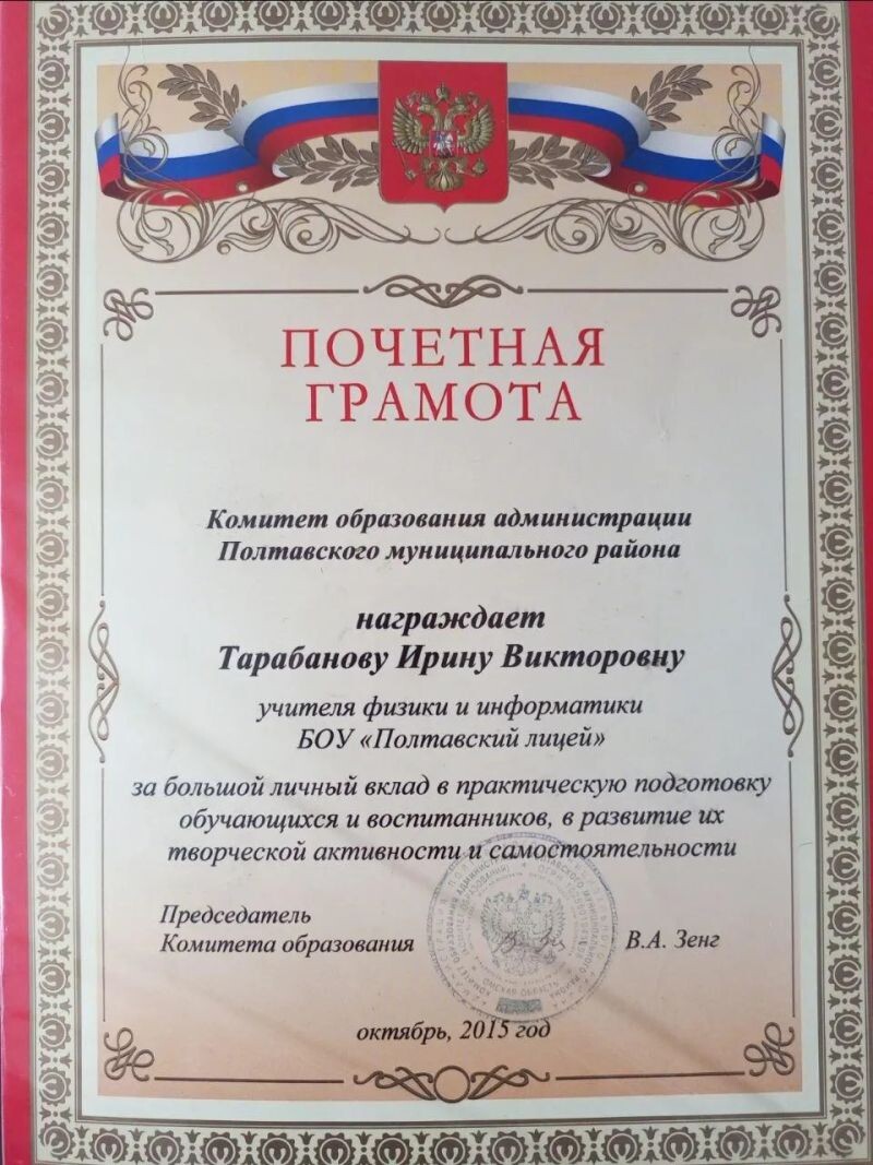 - Комитет образования администрации Полтавского муниципального района, почётная грамота, 2015 г.