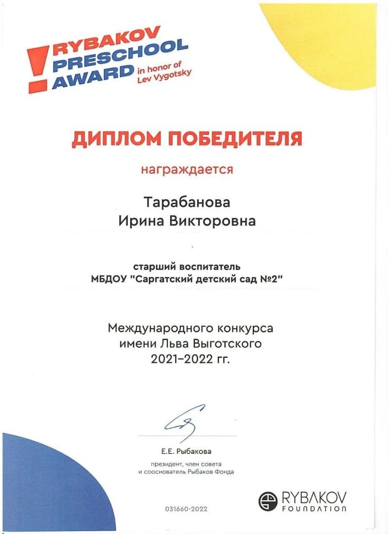- RYBAKOV Foundation, победитель международного конкурса им. Льва Выгодского, 2022 г.