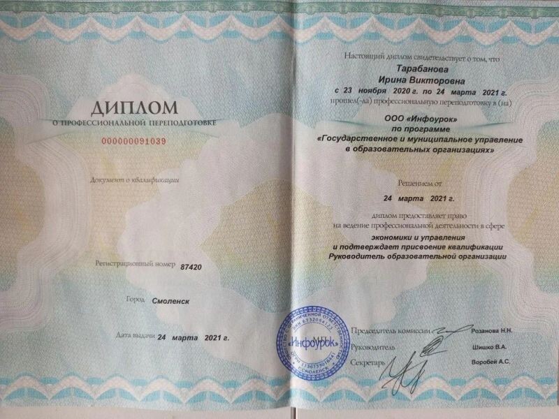 - ООО «Инфоурок», программа «Государственное и муниципальное управление в образовательных организациях», руководитель образовательной организации, 2021 г.