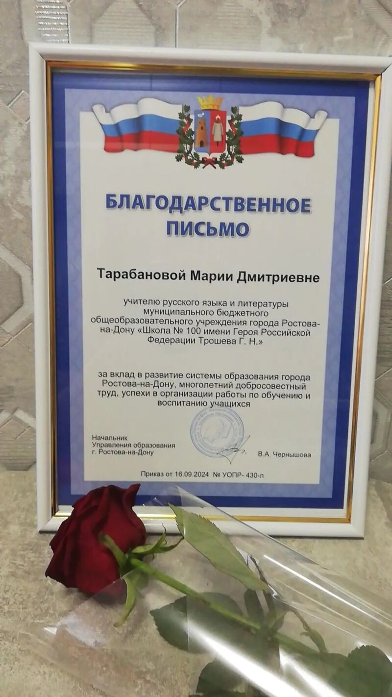 - Управление образования города Ростова-на-Дону, благодарность за вклад в развитие системы образования города Ростова-на-Дону, многолетний добросовестный труд, успехи в организации работы по обучению и воспитанию учащихся, 2024 г.