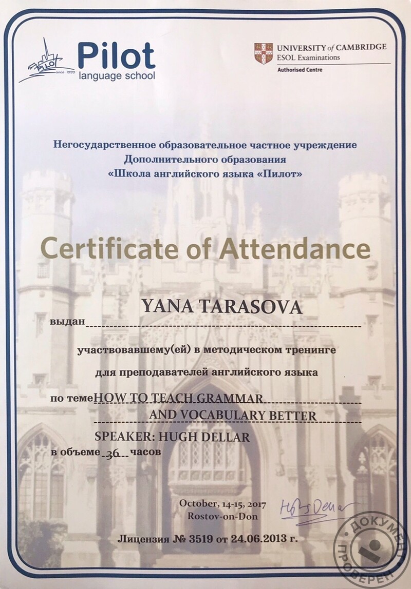 - Школа английского языка «Пилот», авторский курс Хью Деллара по методике преподавания грамматики и словарного запаса в английском языке, 2017 г.
