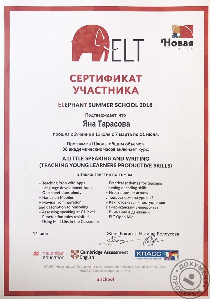 - Курс по методике преподавания английского языка детям в рамках Elephant Summer School, 2018 г.