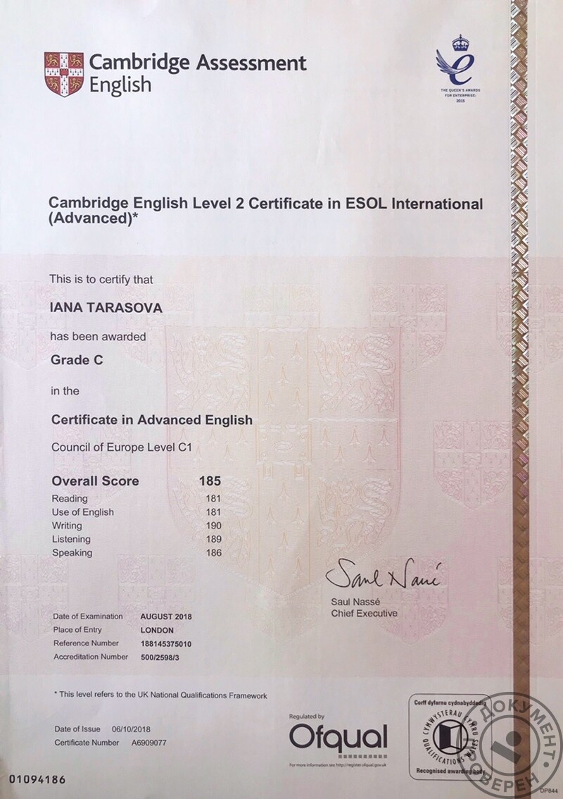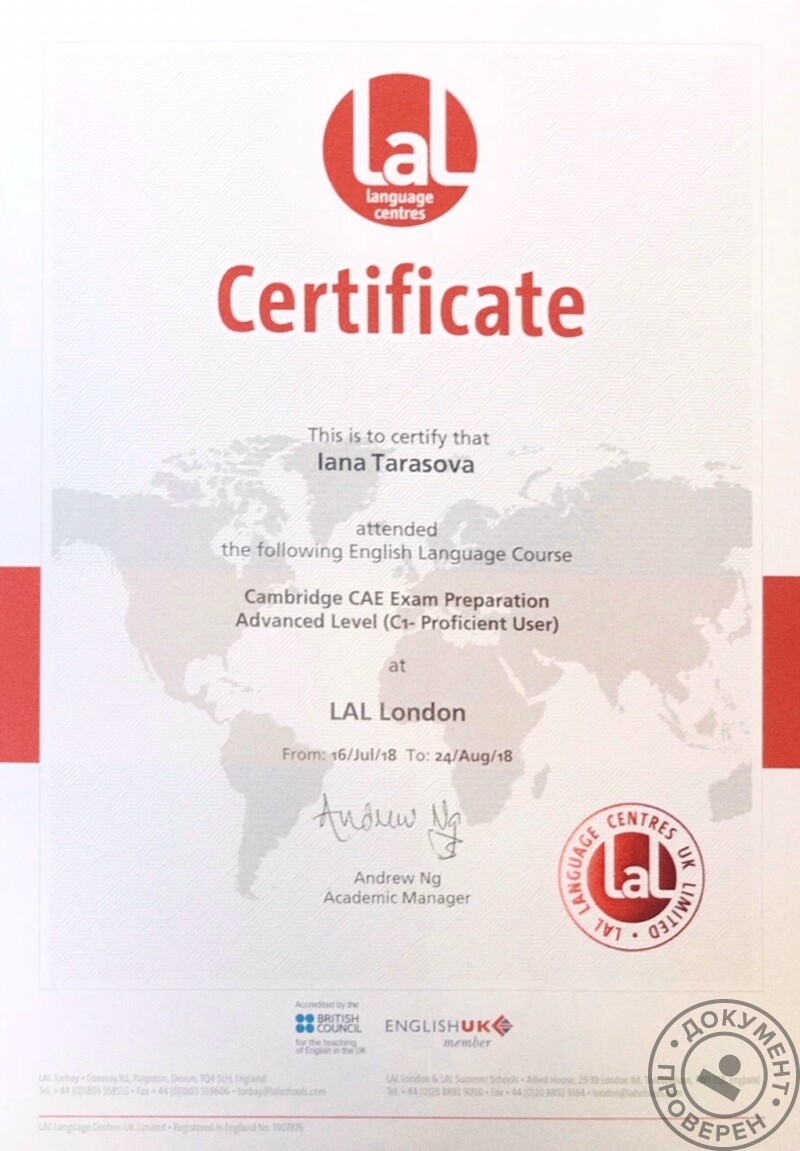 - Курс подготовки к сдаче международного экзамена по английскому языку в английском языковом центре (г. Лондон, Великобритания), 2018 г.