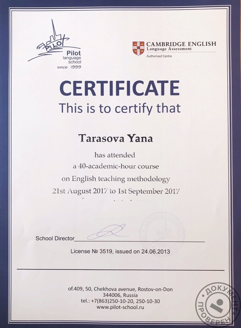 - Языковая школа Pilot, курс по методике преподавания английского языка (40 ч), 2017 г.