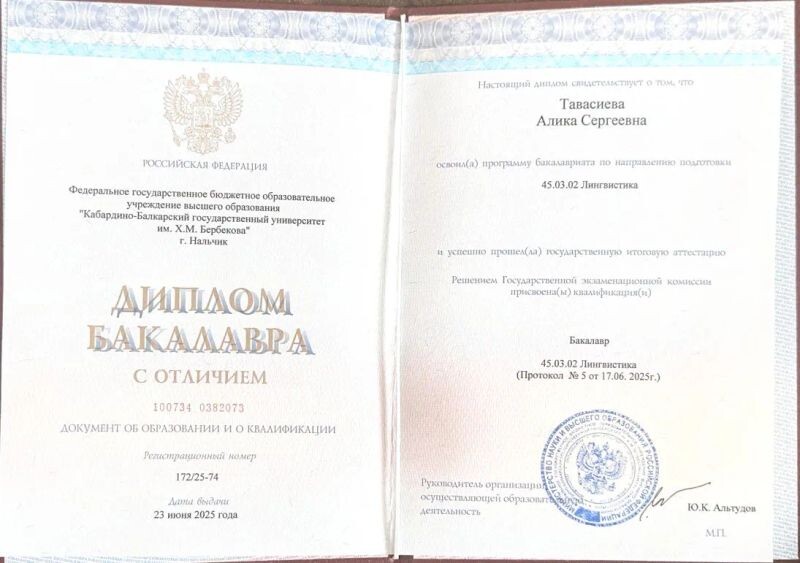 - Кабардино-Балкарский Государственный Университет Диплом о дополнительном образовании. Профессиональная переподготовка на учителя английского языка, 2024–2025 гг.