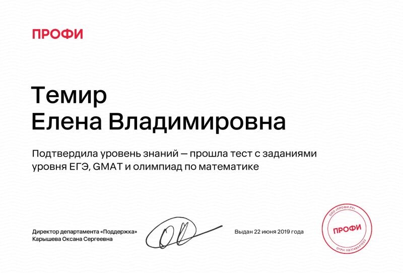- Подтвердила уровень знаний — Прошла тест с заданиями уровня ЕГЭ, GMAT и олимпиад по математике (с 2019 г.).