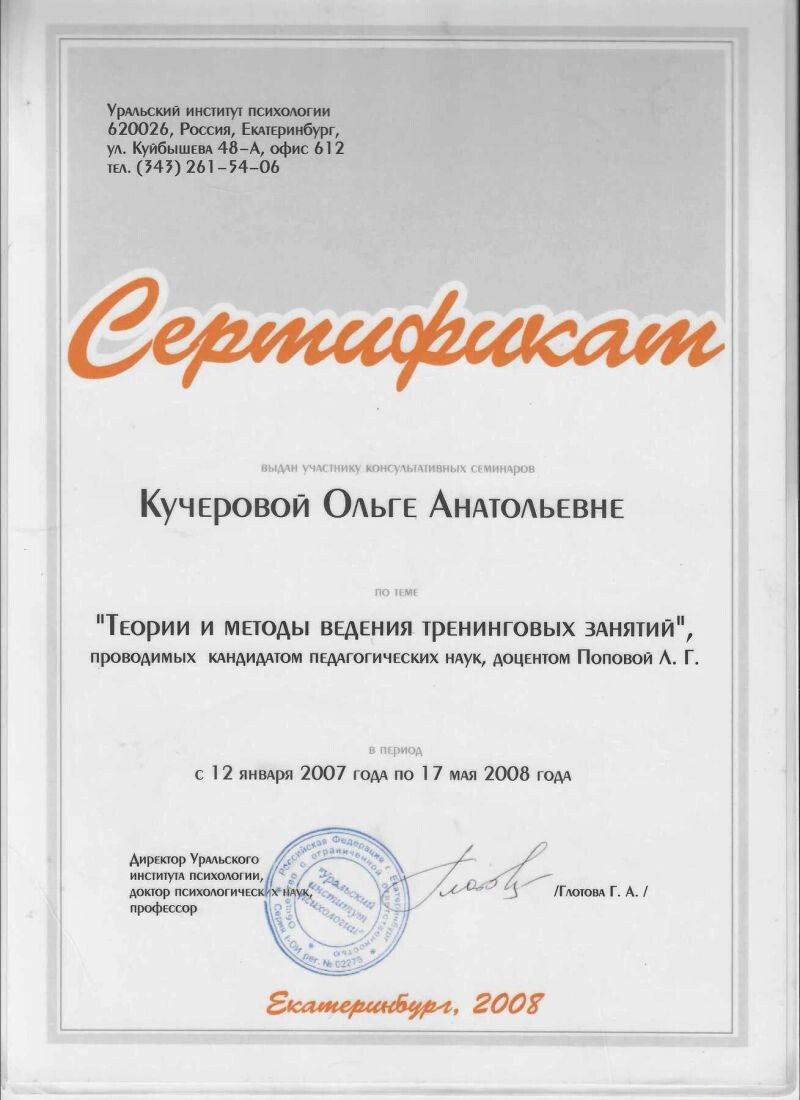 - Уральский институт психологии (г. Екатеринбург), цикл консультативных семинаров по теме «Теории и методы ведения тренинговых занятий», 2007–2008 гг.