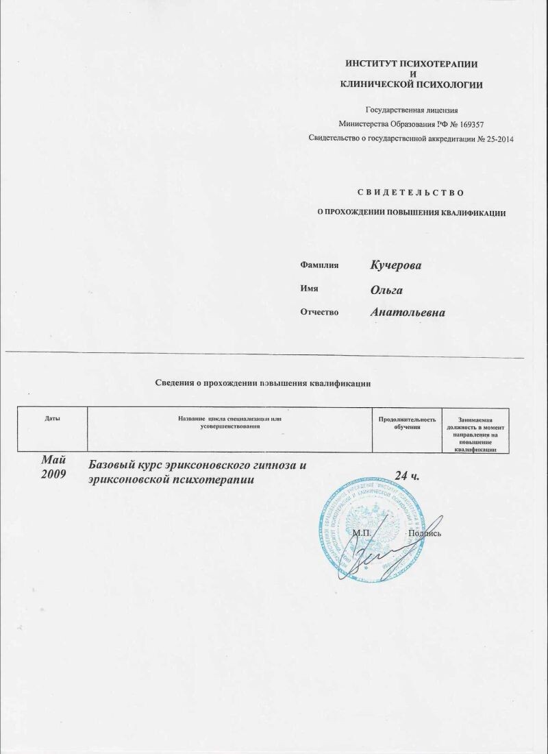 - ИПиКП, программа «Базовый курс эриксоновского гипноза и эриксоновской психотерапии» (24 ч.), 2009 г.