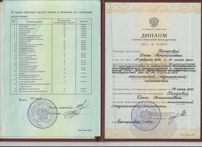 - Уральский государственный университет им. А.М. Горького, профессиональная переподготовка, клиническая (медицинская) психология, 2010 г.