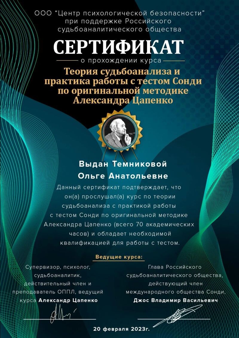 - ООО «Центр психологической безопасности», курс «Теория судьбоанализа и практика работы с тестом Сонди по оригинальной методике Александра Цапенко», 2022 г.