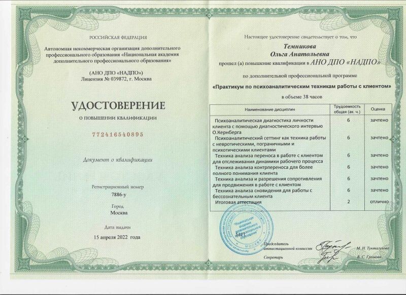 - НАДПО, программа «Практикум по психоаналитическим техникам работы с клиентом» (38 ч.), 2022 г.