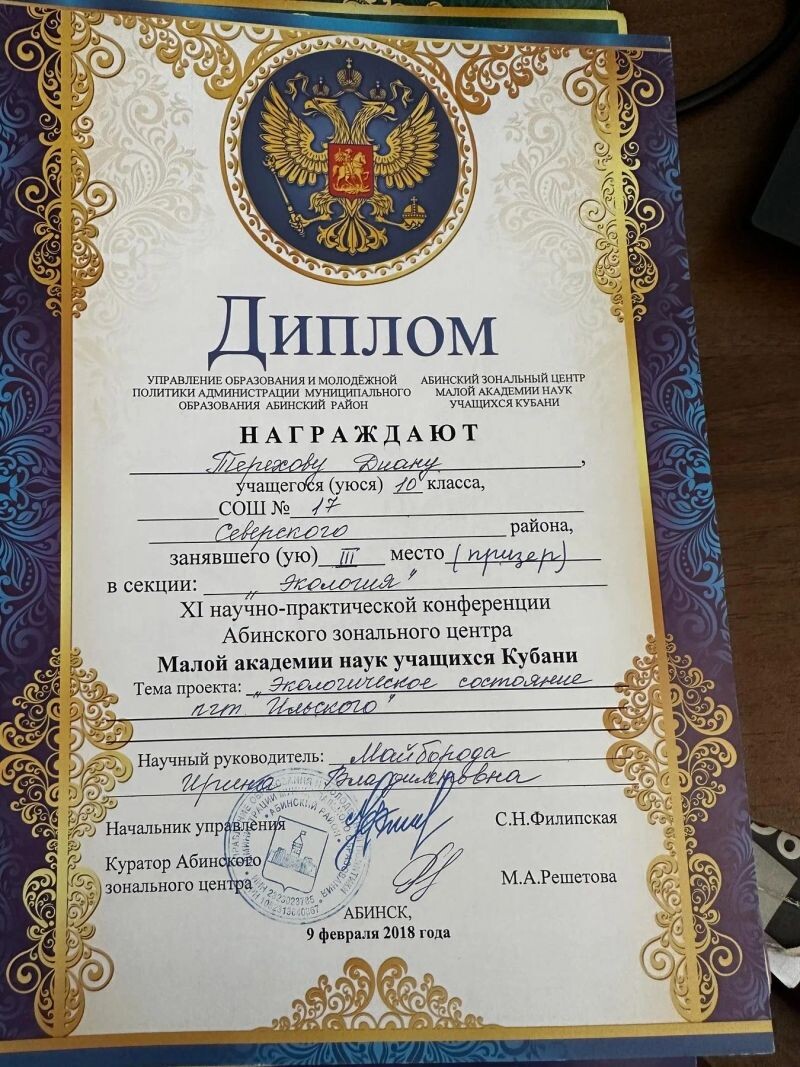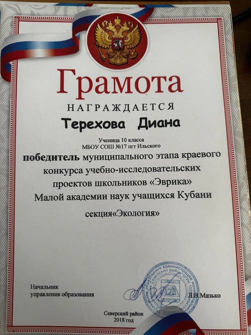 - Малая академия наук учащихся кубани, 3 место, призёр, секция «Экология», диплом, 2018 г.