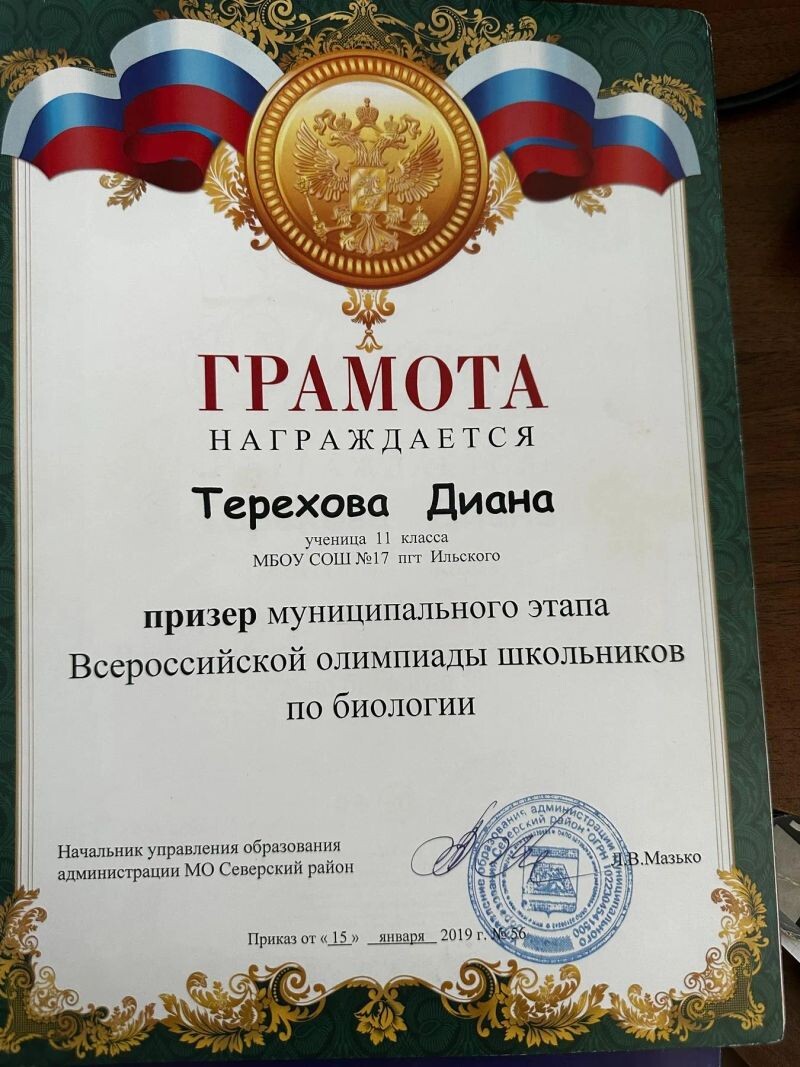 - СОШ № 17, призер муниципального этапа ВОШ по биологии, грамота, 2019 г.