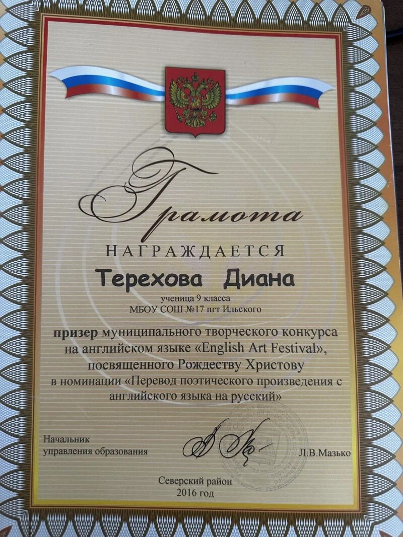 - Призёр муниципального творческого конкурса на английском языке English art festival, 2016 г.