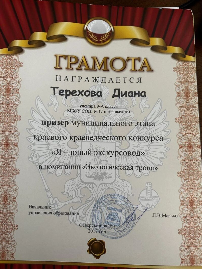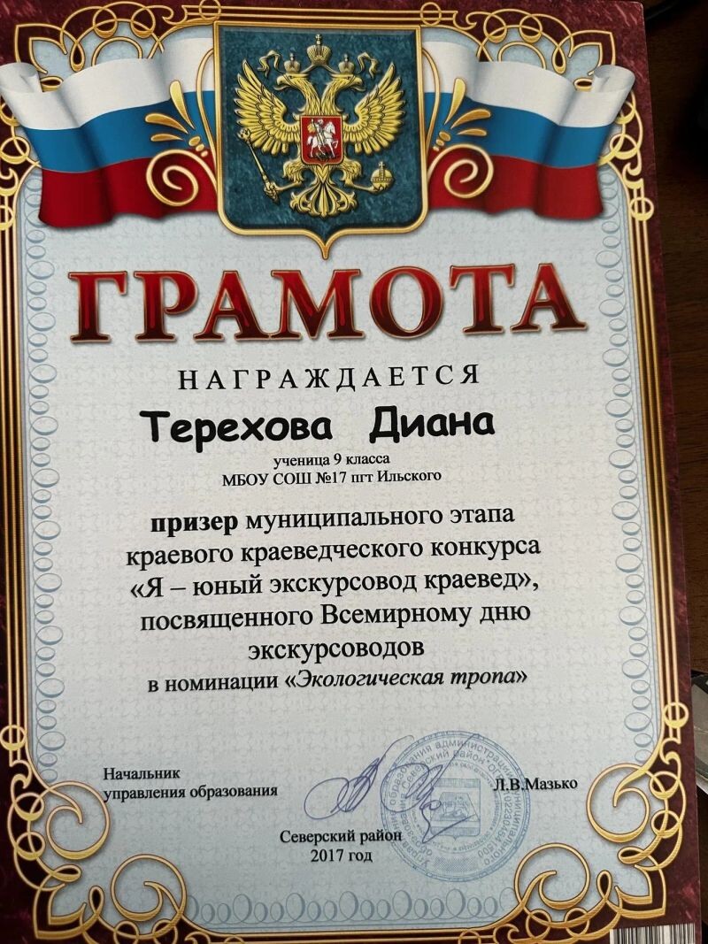 - СОШ № 17, призер муниципального этапа краевого краеведческого конкурса «Я - юный экскурсовод краевед», посвященного Всемирному дню экскурсоводов в номинации «Экологическая тропа», грамота, 2017 г.