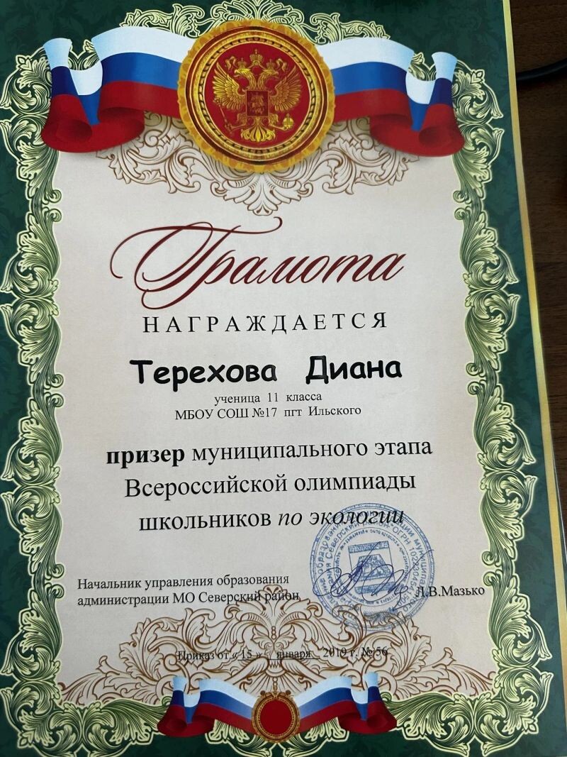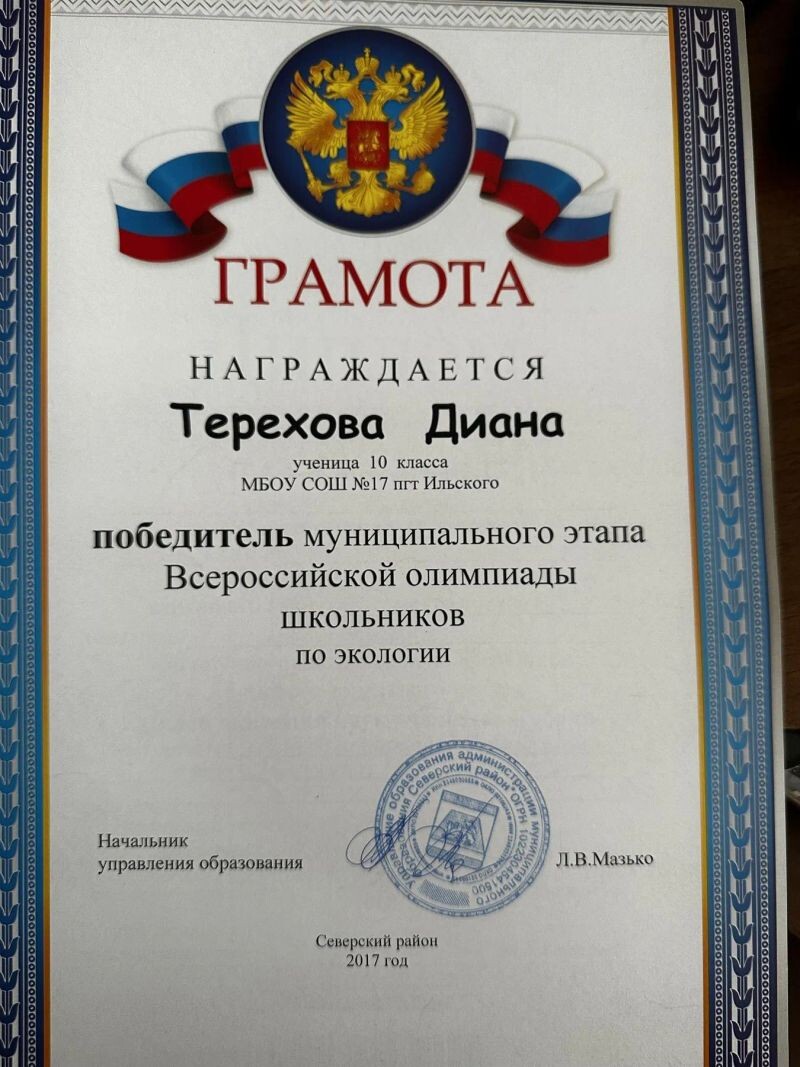 - Управления образования администрации муниципального образования Северский район, победитель муниципального этапа ВОШ по экологии, грамота, 2017 г.