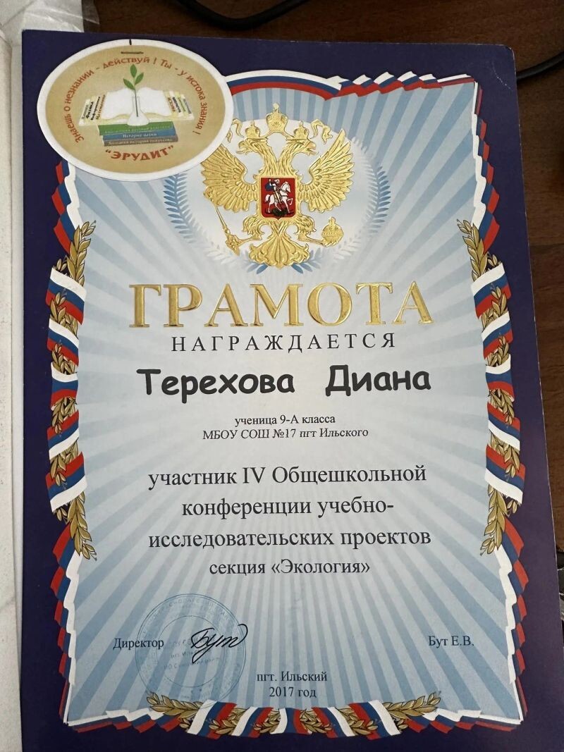 - СОШ № 17, участник IV Общешкольной конференции учебно-исследовательских проектов секция «Экология», грамота, 2017 г.