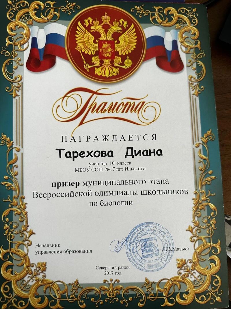 - СОШ № 17, призер муниципального этапа ВОШ по биологии, грамота, 2017 г.
