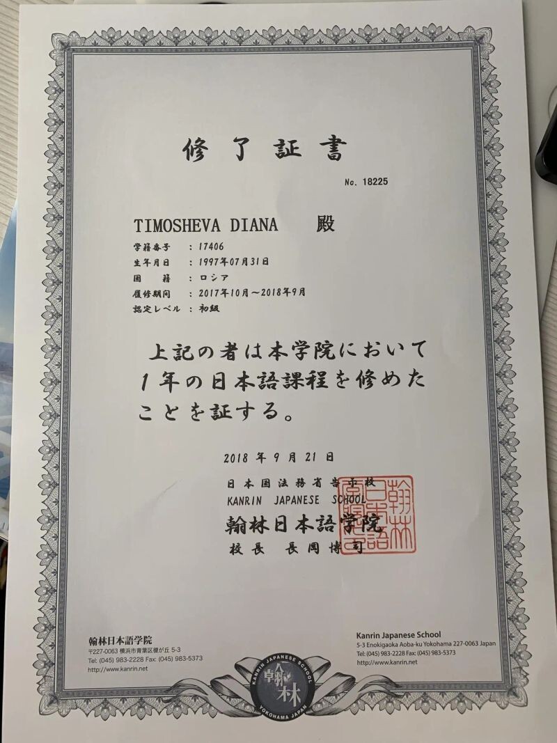 - Kanrin Japanese School, курс японского языка, 2017–2018 гг.
