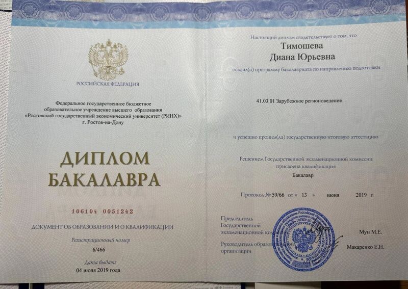 - ФГБОУ ВО «Ростовский государственный экономический университет (РИНХ)», программа бакалавриата по направлению подготовки «Зарубежное регионоведение», 2015–2019 гг.