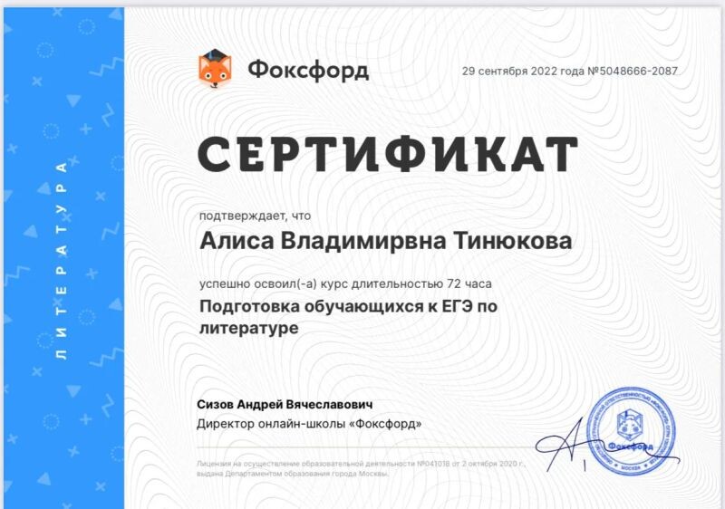 - Фоксфорд,методики преподавания литературы ЕГЭ (с 2022 г.).