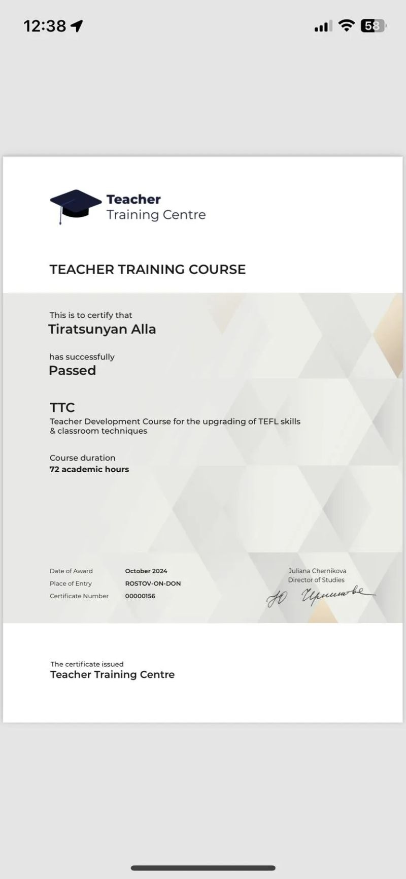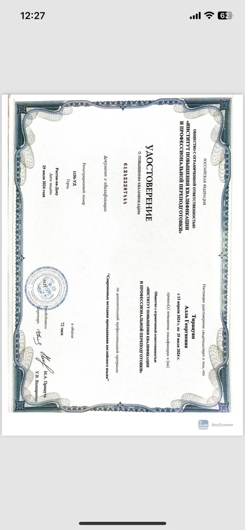 - Удостоверение о повышении квалификации « современные методики преподавания английского языка « (с 2024 г.).