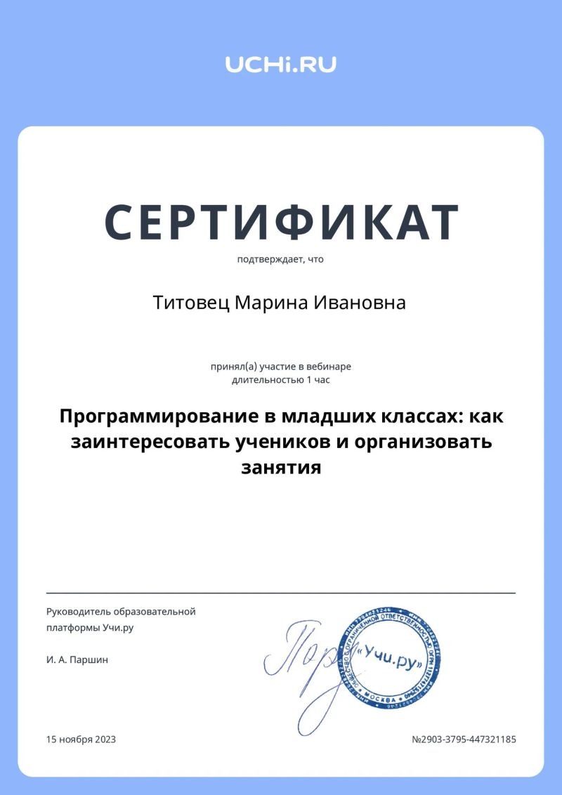 - ООО «Учи.ру» вебинар «Программирование в младших классах: как заинтересовать учеников и организовать занятия», 2023 г.