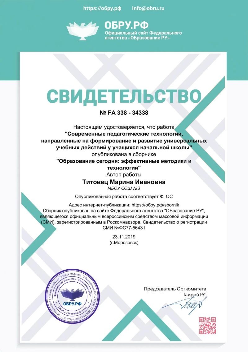 - Свидетельство о публикации работы «Современные педагогические технологии, направленные на формирование и развитие универсальных учебных действий у учащихся начальной школы », 2019 г.