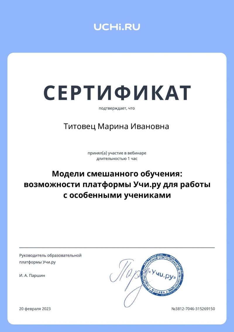 - ООО «Учи.ру» вебинар «Модели смешанного обучения: возможности платформы Учи.ру для работы с особенными учениками», 2023 г.