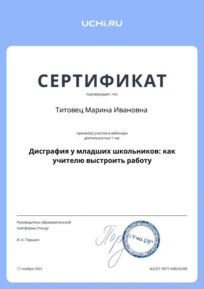 - ООО «Учи.ру», вебинар «Дисграфия у младших школьников: как учителю выстроить работу», 2023 г.
