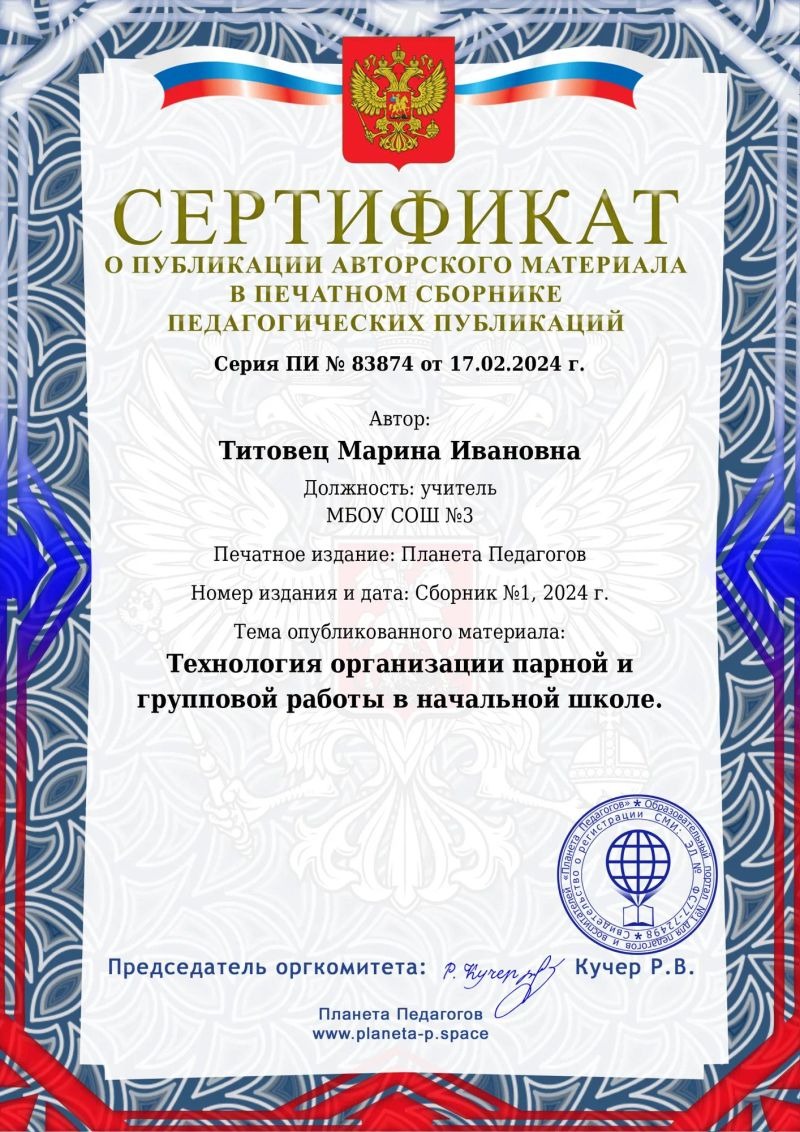 - Публикация в авторском сборнике материала на тему «Технология организации парной и групповой работы в начальной школе», 2024 г.