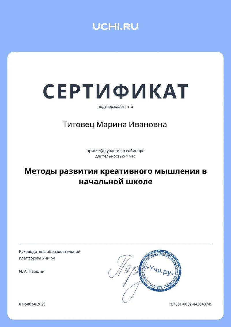 - ООО «Учи.ру», вебинар «Методы развития креативного мышления в начальной школе», 2023 г.