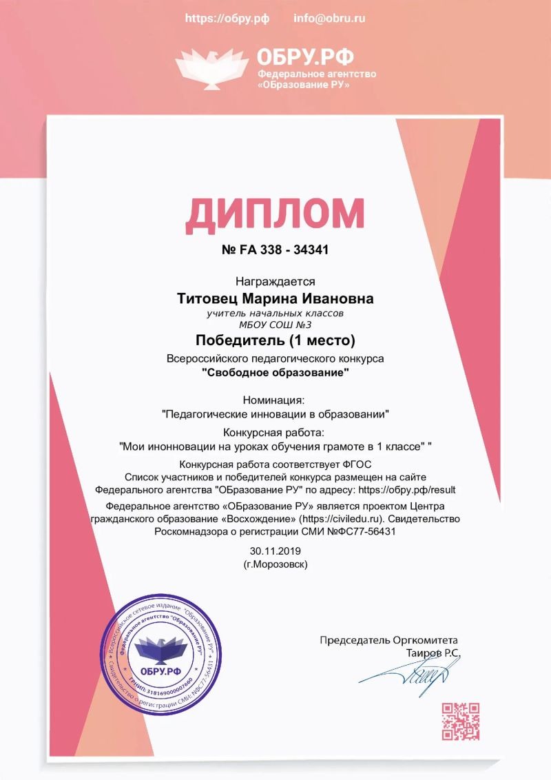 - Диплом победителя Всероссийского педагогического конкурса «Свободное образование», 2019 г.