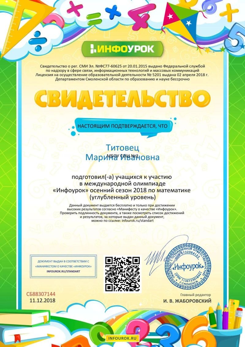 - ООО «Инфоурок», подготовка учащихся к участию в международной олимпиаде «Инфоурок» осенний сезон 2018 по математике (углубленный уровень).
