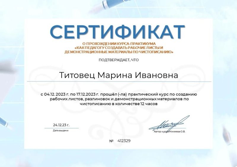 - Практический курс «Как педагогу создавать рабочие листы и демонстрационные материалы по чистописанию», 2023 г.