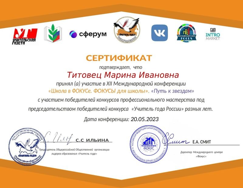 - Участие в XII Международная конференция «Школа в ФОКУСе. ФОКУСЫ для школы». «Путь к звездам», 2023 г.