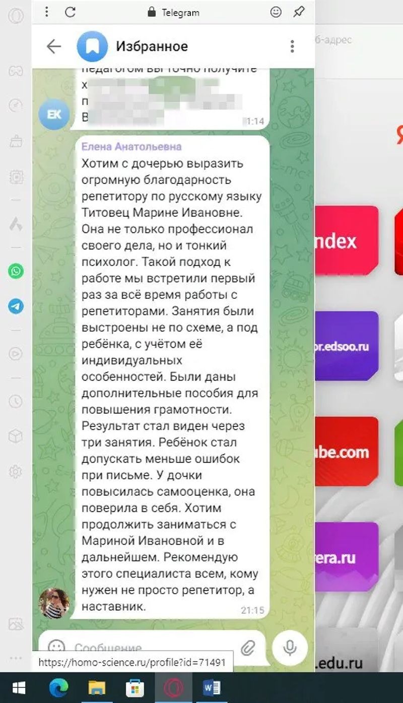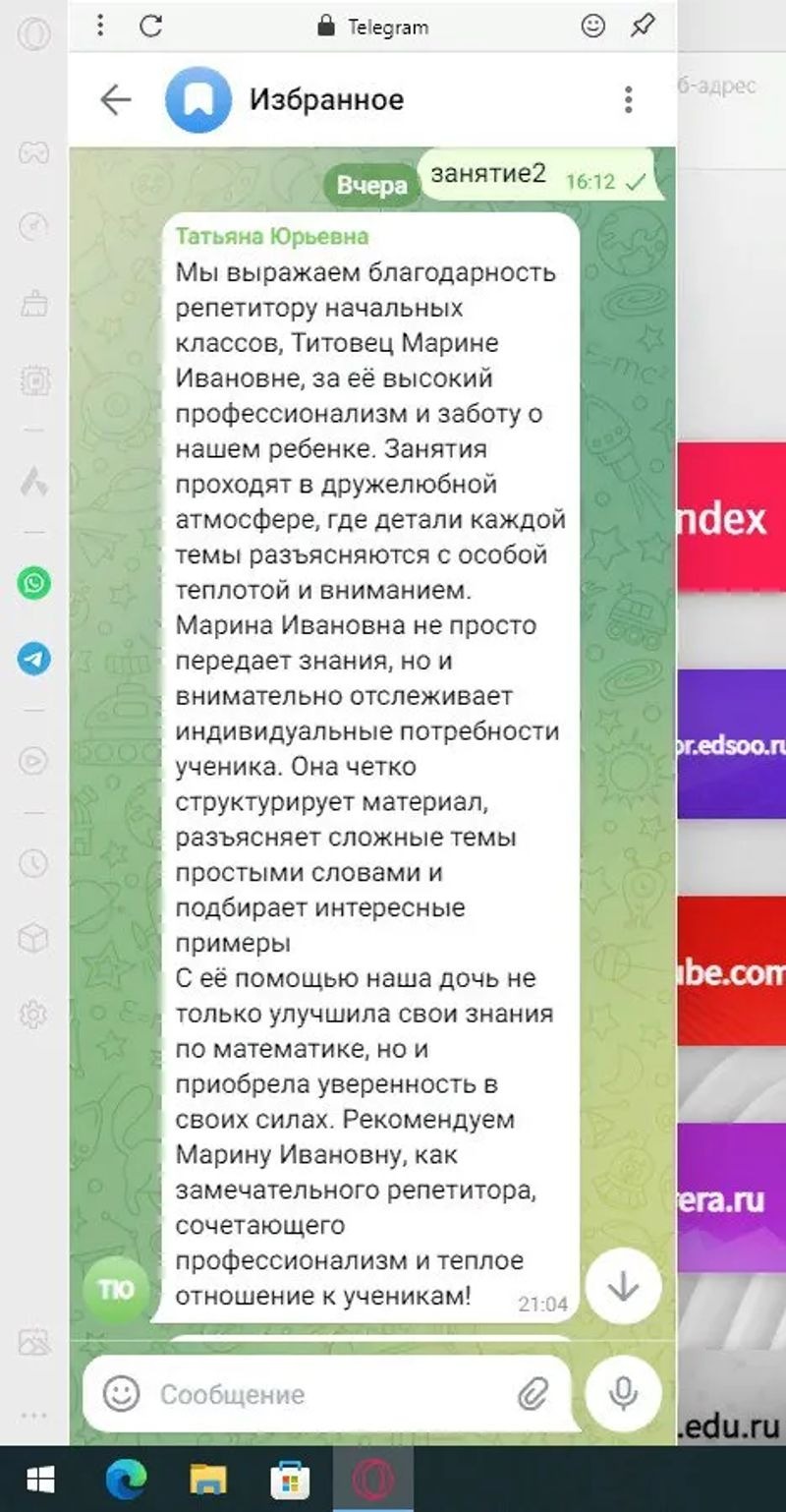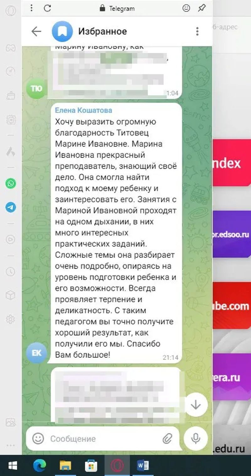 Марина Ивановна, огромное спасибо за вашу помощь. Мы обратились к специалисту в конце учебного года, в надежде исправить итоговую тройку по математике. За май, учитель помог подтянуть программу по математике, помог ребенку поверить в свои силы- стать увереннее, научить азам подключения к звонку) Все уроки готовились очень грамотно по учебнику нашей программы, были интерактивные задания, по несколько презентаций на одном уроке. Тему урока мы могли обговаривать утром, а вечером уже был звонок и Марина Ивановна успевала подготовиться и подстроиться под нас. Ребёнок с удовольствием подключался на звонок, не стеснялся и раскрывался, а после урока делился приятными впечатлениями. Все это говорит о том, что педагог готовится к каждому занятию, с душой и любовью относится к своей работе. Дети - это чувствуют. Еще раз спасибо за вашу работу🤗