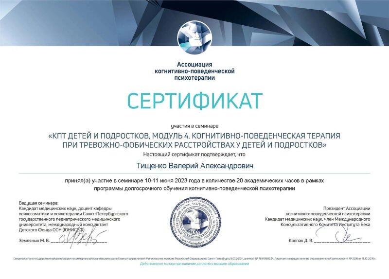 - Ассоциация когнитивно-поведенческой психотерапии, семинар «КПТ детей и подростков, модуль 4. Когнитивно-поведенческая терапия при тревожно-фобических расстройствах у детей и подростков», 2023 г.