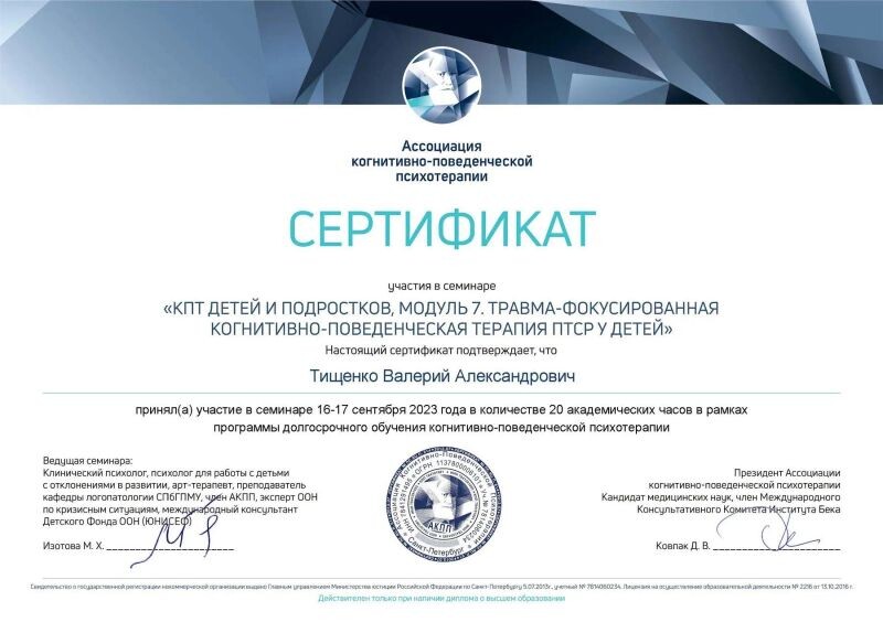 - Ассоциация когнитивно-поведенческой психотерапии, семинар «КПТ детей и подростков, модуль 7. Травма-фокусированная когнитивно-поведенческая терапия ПТСР у детей», 2023 г.