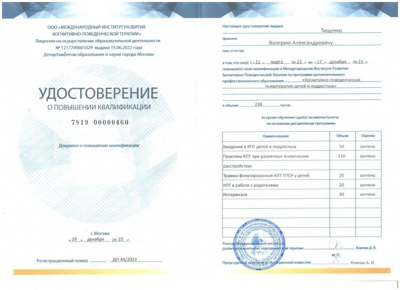 - ООО «Международный институт развития когнитивно-поведенческой терапии», г. Москва (Ассоциация когнитивно-поведенческой психотерапии), курс повышения квалификации «Когнитивно-поведенческая психотерапия детей и подростков», 2023 г.
