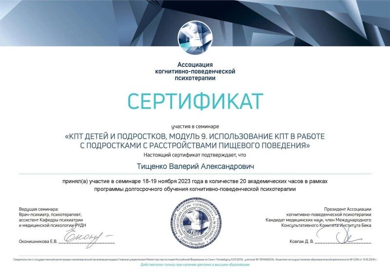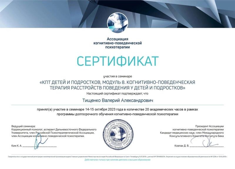 - Ассоциация когнитивно-поведенческой психотерапии, семинар «КПТ детей и подростков, модуль 8. Когнитивно-поведенческая терапия расстройств поведения у детей и подростков», 2023 г.