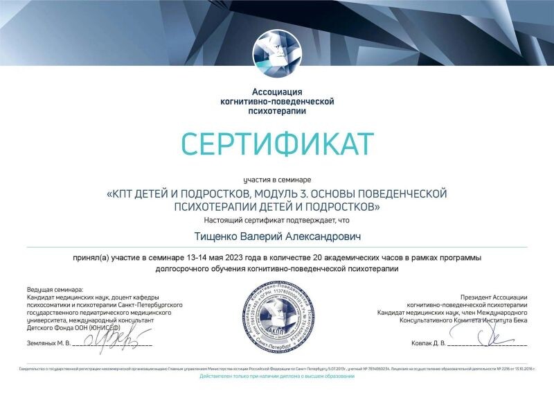 - Ассоциация когнитивно-поведенческой психотерапии, семинар «КПТ детей и подростков, модуль 2. Основы поведенческой психотерапии детей и подростков», 2023 г.