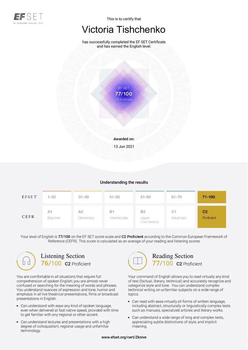 - EF SET Certificate, 2021 г.