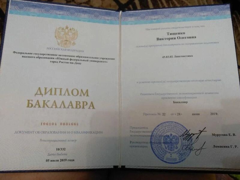 - Южный Федеральный Университет - ИФЖИМКК, факультет лингвистики, практика и методика преподавания иностранных языков и культур, 2015–2019 гг.