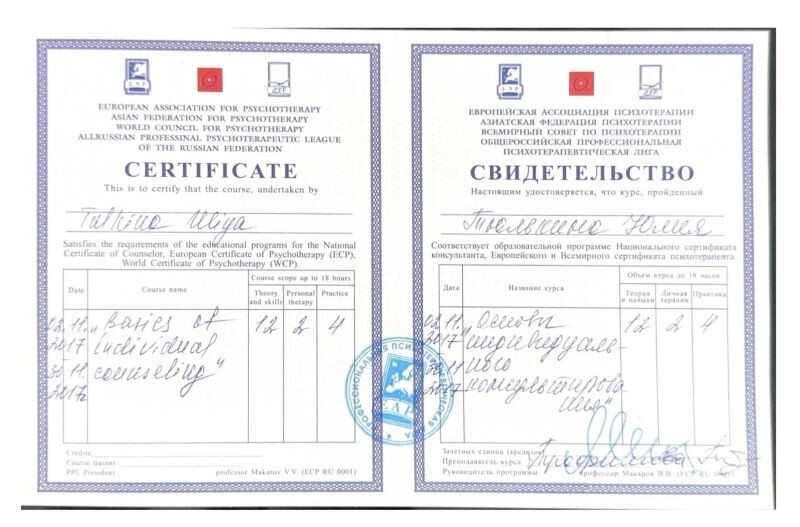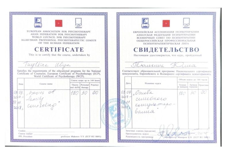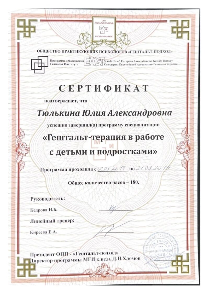 - ОПП «Гештальт-подход», МГИ, программа «Гештальт-терапия в работе с детьми и подростками», 2018–2019 гг.