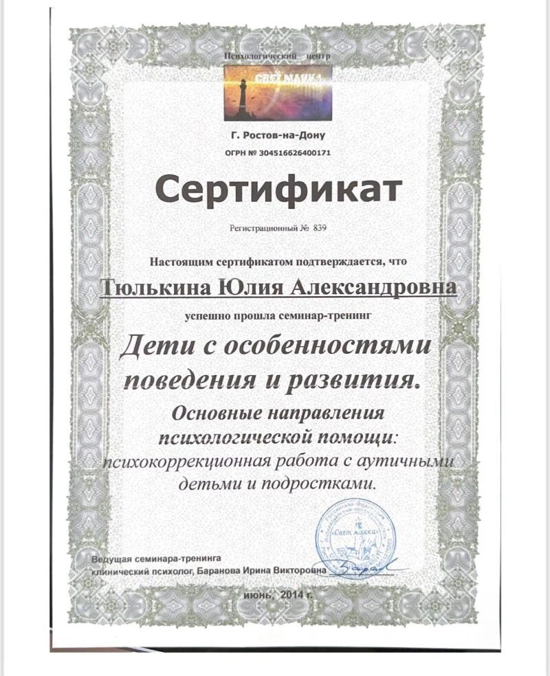 - Психологический центр «Свет маяка», семинар-тренинг «Дети с особенностями поведения и развития. Основные направления психологической помощи: психокоррекционная работа с аутичными детьми и подростками», 2014 г.